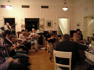 バイオリン持って行くとすでにBjornを囲んでじゃんじゃん弾いていた。普段ニッケルハルパを弾く人も今日はみんなバイオリンで(この地方の伝統はバイオリン。残念ながらニッケルハルパでセッションに参加した人は、合わないと思ったのか早々に退散)。みんなエライ人ばかりだからと、私とクラスメート数人は端っこで参加。