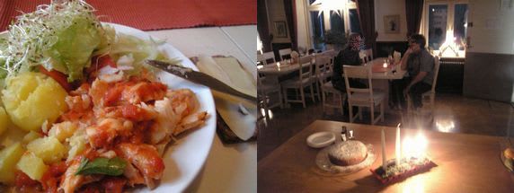 右の写真はfika(ティータイム)で出てきた焼き立てケーキ(socker kakaと言っていた)。テーブルにいる二人は学校スタッフ。