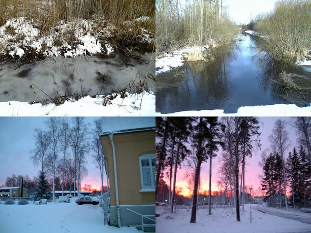 写真左:雪の上に流れる水。氷ではなく雪。小川が全てクリーム色できれい。