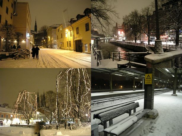 Grandで演奏 その2-ウプサラ、夜の雪景色 スウェーデン生活 2007.01.212025.09.19 (その1の続き)で、その0時をまわった帰り道。粉雪がさらに激しく舞っていた。夜の雪の舞うウプサラはライトアップされていてとてもきれい。 写真右下は、ウプサラ駅のホーム。