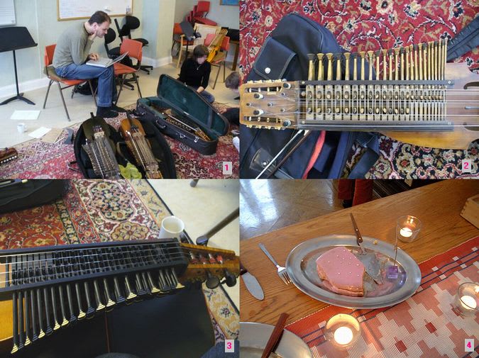 話の合間には、持参のノートPCとケーブルを接続し、過去のプロジェクトや最近の作品までPCファイルから聞かせてくれたり、写真1の3つのニッケルハルパをつかって演奏してくれた。