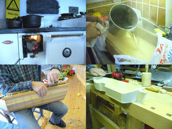 熱湯で柔らかくなった板を取り出し、欲しいカーブに合わせて作った土台にしっかりとおさえつけ、添え木をあて紐で縛る。