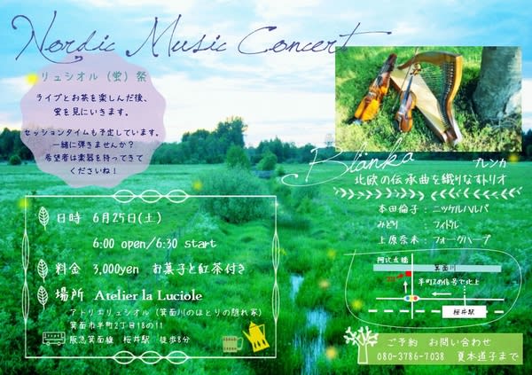 6/25 箕面市 リシュオル祭 ※アトリエ・リシュオルで、ハープ、フィドル、ニッケルハルパのハウス・ライブ。終了後、箕面川に蛍を見に行きます。そのあと、セッションタイムもあるので、楽器持参でご参加ください。冒頭のチラシがそれです。チラシの背景は、私がスウェーデンにいた時、駅までの道のりでパチリと写したもの。のどかです。