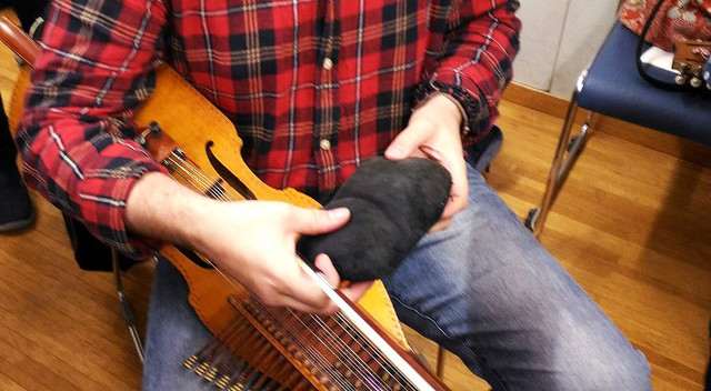 さて、この写真ですが、11月に来日したダニエルに見せてもらった、ニッケルハルパのクッション。真ん中のくびれは長年使ったことによるへたりです。